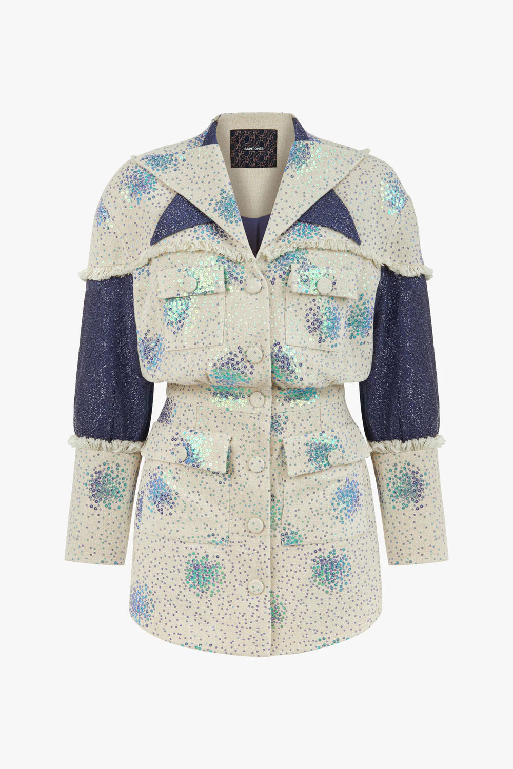 Detaylar: Mini boy, pul payet işlemeli yuvarlak desenler, püsküllü omuz paneli, koyu mavi payetli yaka ve kolluklar, kapaklı cepler