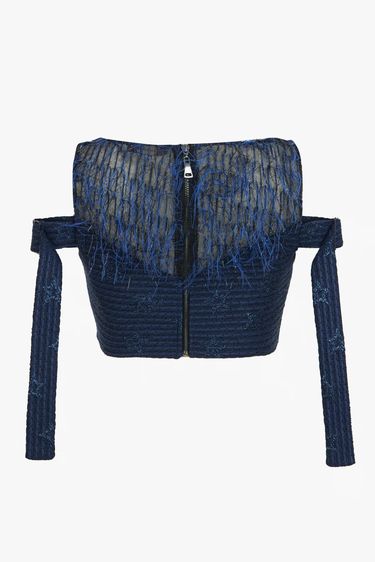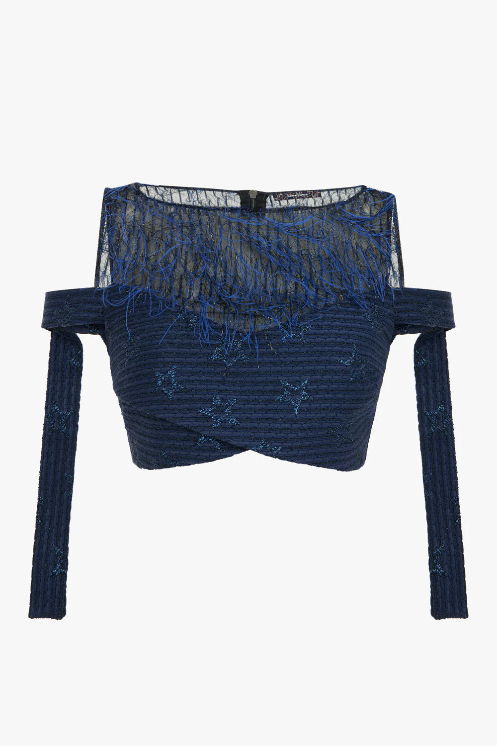 Koyu lacivert tonlarında, uzun kollu kısa kesim (crop) top modelidir. Omuzları açıkta bırakan kayık yaka tasarımına sahiptir. Ana gövde kumaşı dokulu ve fitilli görünümlü olup, üzerinde parlak mavi ipliklerle işlenmiş yıldız desenleri bulunur. Yaka çevresi ve omuzların hemen altı şeffaf tül üzerine uzun mavi püskül detayı ile süslenmiştir. Uzun kolların omuz kısımları açıktır ve kollar da ana kumaşla aynı yıldız desenli dokuya sahiptir. Sırt kısmında boydan boya fermuar kapama mevcuttur.