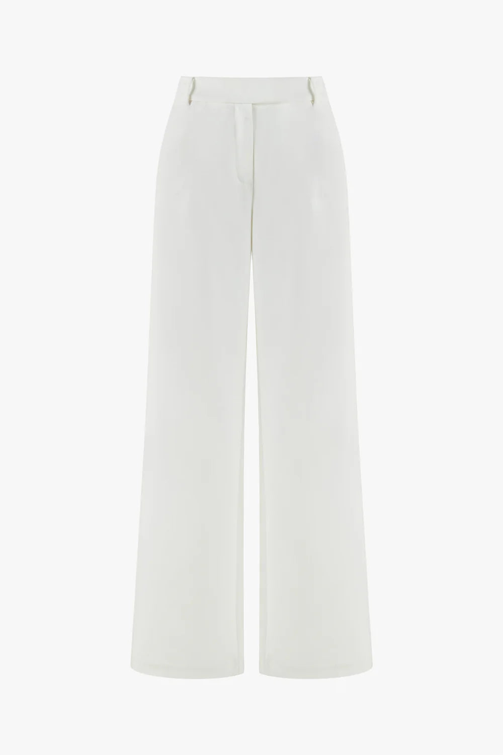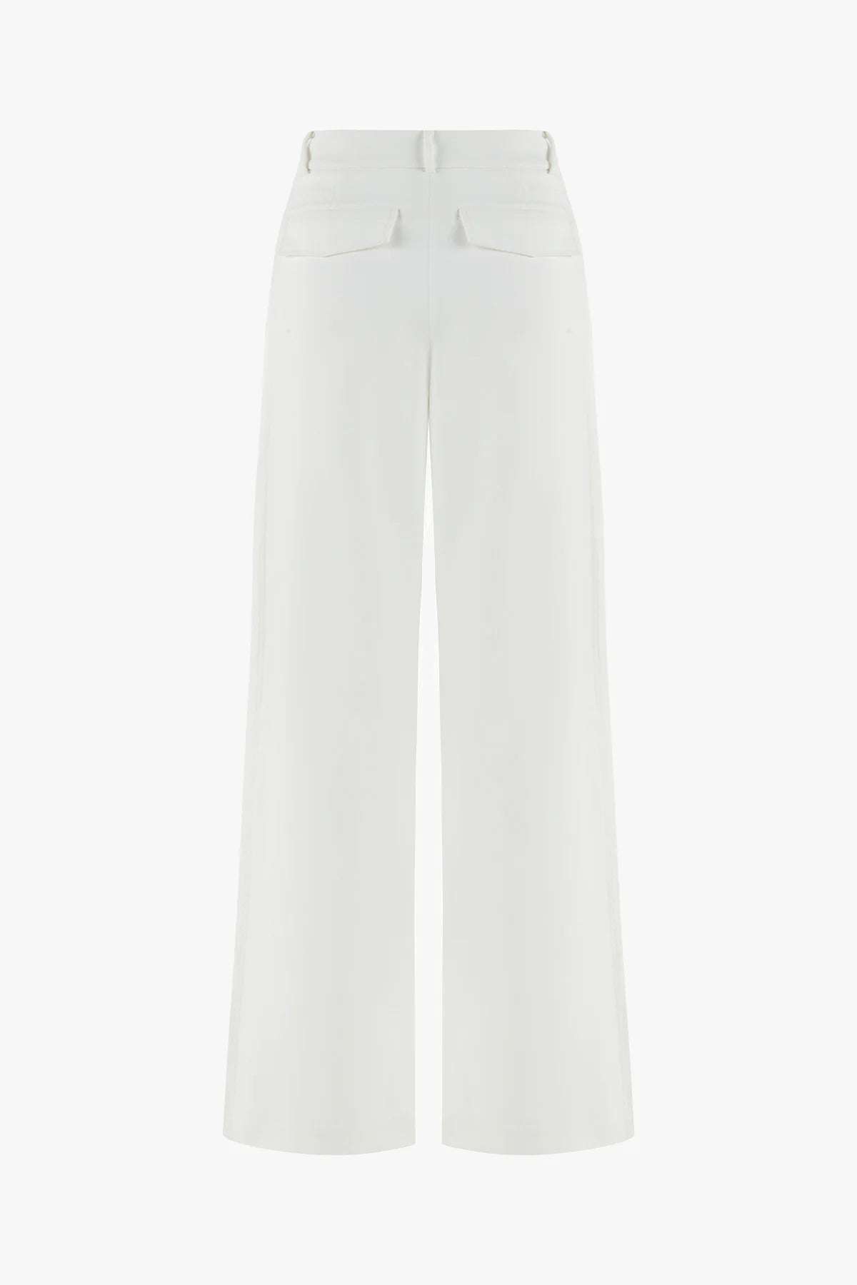 Beyaz veya ekru tonlarında, yüksek bel kumaş pantolon modelidir. Baştan sona geniş paça (wide leg) kesimine sahiptir ve uzun, dökümlü bir silüet oluşturur. Bel kısmı düz ve dardır, ön ortadan gizli fermuar ve kopça ile kapama mevcuttur. Yanlarda düz, dikişsiz cepler bulunur. Arka kısmında ise her iki yanda kapaklı cep detayları yer alır. Pantolonun tamamında sade, pürüzsüz ve mat bir kumaş kullanılmıştır.