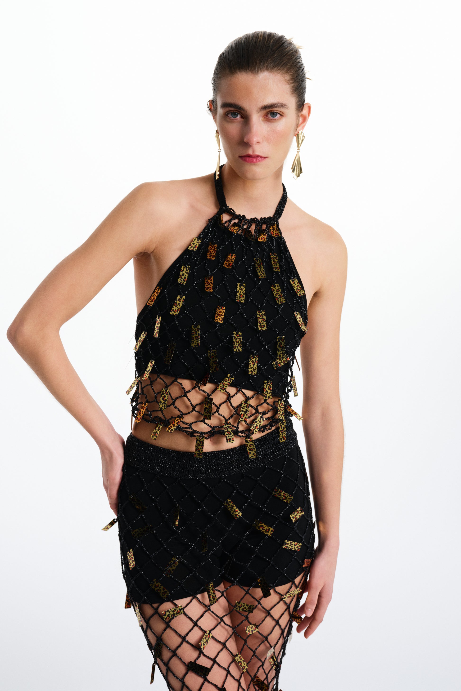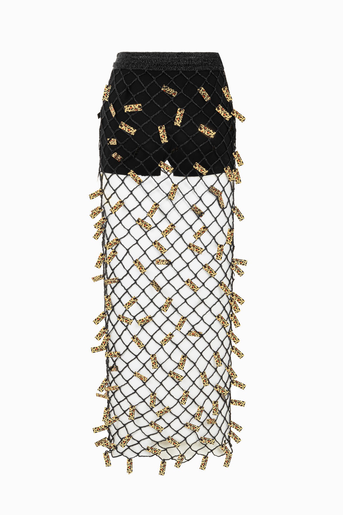 Siyah mini etek üzerine siyah file kumaş geçirilmiş, file yüzeyde leopar desenli aplike detayları bulunan uzun etek.