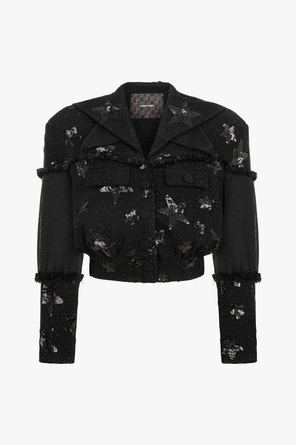 Detaylar: Kısa kesim (crop), yıldız kelebek pul payet işlemeler, vatkalı omuzlar, püskül detayları, kapaklı cepler