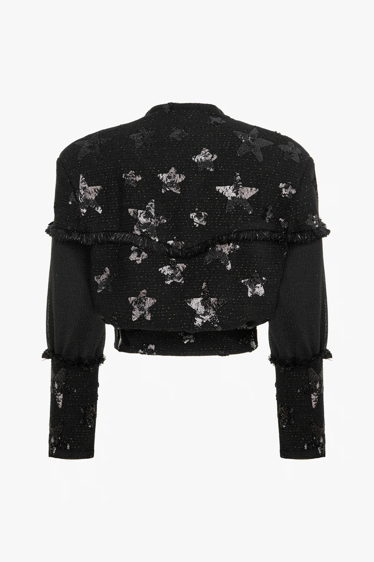 Siyah renkte, uzun kollu kısa kesim (crop) ceket modelidir. Kumaşı dokulu, tüvit görünümlüdür ve üzerine parlak pul payetlerle işlenmiş yıldız ve kelebek desenleri bulunur. Omuzları belirgin vatkalı ve dik duruşludur. Ön kısmı düğmeli kapamalıdır; yaka ceket yaka şeklinde, yaka çevresi ve göğüs hizasında yatay püskül detayları yer alır. Ön yüzeyde iki adet kapaklı cep detayı mevcuttur. Kolları tüvit kumaş ve siyah örgü kumaş panellerin birleşimi olup, manşetler tüvit püskül ve payet detaylarla hareketlendirilmiştir.