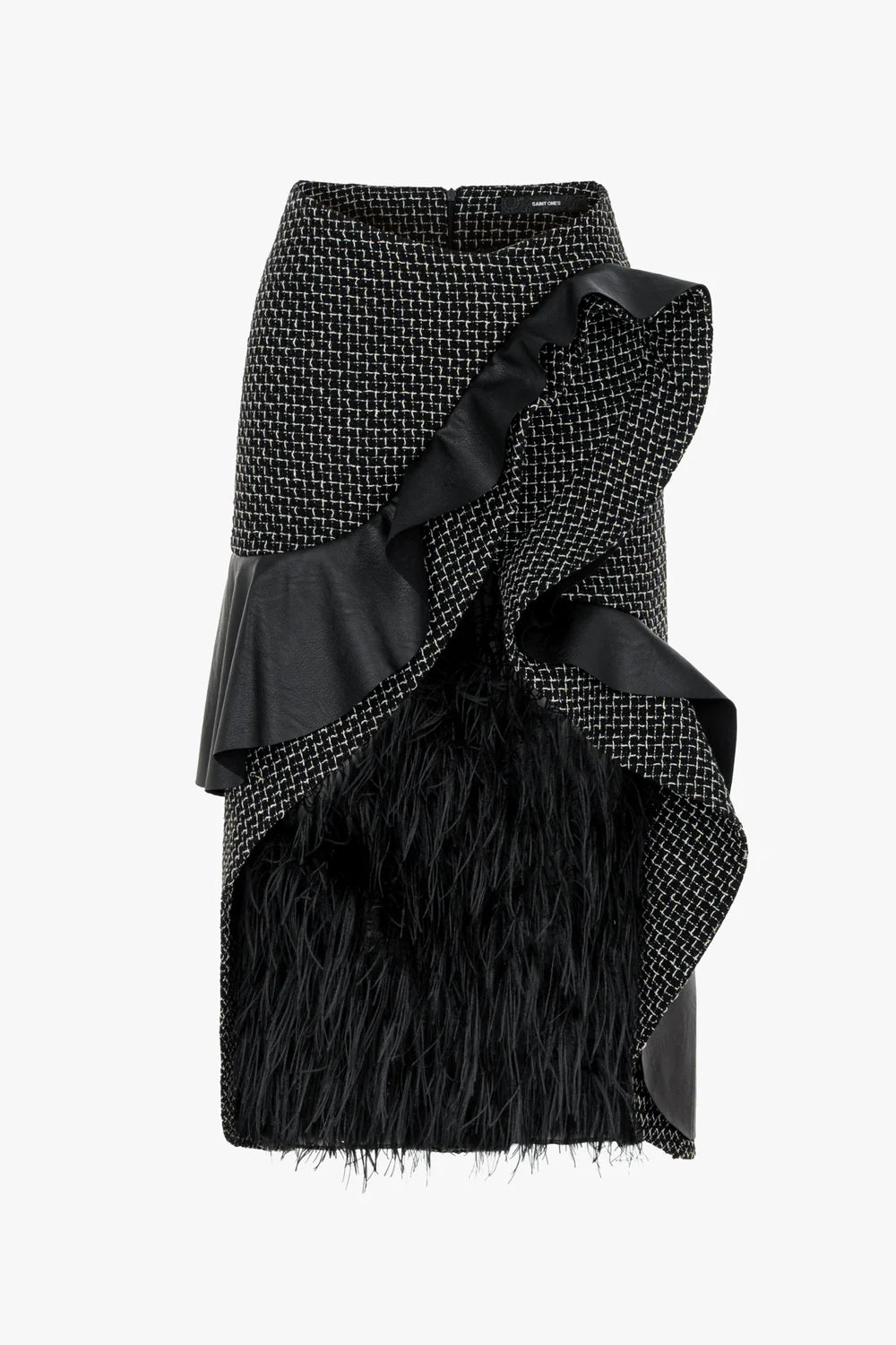 Detaylar: Yüksek bel, asimetrik kesim, deri görünümlü fırfırlar, uzun siyah tüylü püskül detayı