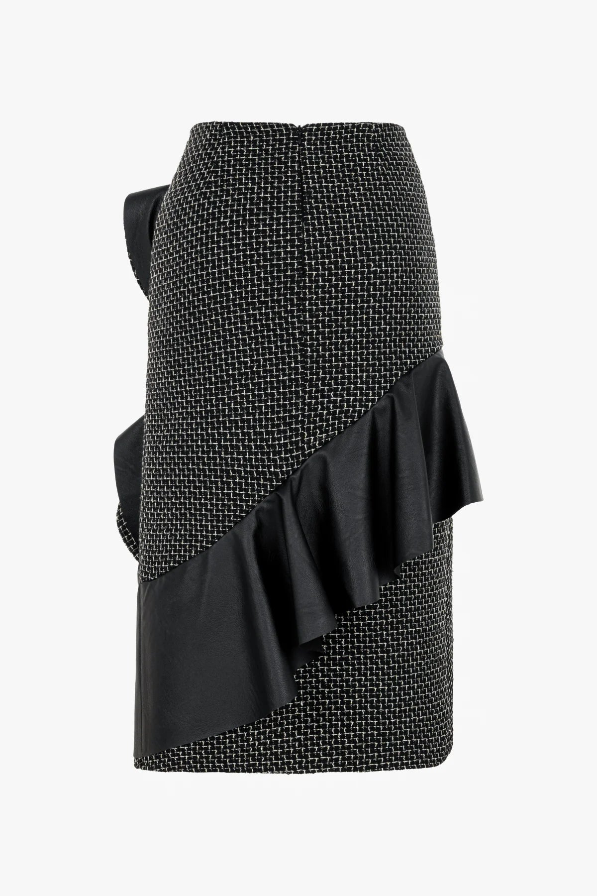 Siyah ve beyaz ipliklerin kullanıldığı tüvit görünümlü kumaştan üretilmiş, yüksek bel etek modelidir. Diz hizasında veya hafif üstünde mini boy uzunluğundadır ve vücuda oturan düz bir kesime sahiptir. Eteğin ön ve yan kısımları, siyah deri görünümlü fırfırlar ile çevrili asimetrik bir tasarıma sahiptir. Fırfırların altındaki açıklıkta ve etek ucunun bir kısmında uzun, siyah tüylü püskül detayı kullanılmıştır. Arka ortada gizli fermuar kapama mevcuttur.