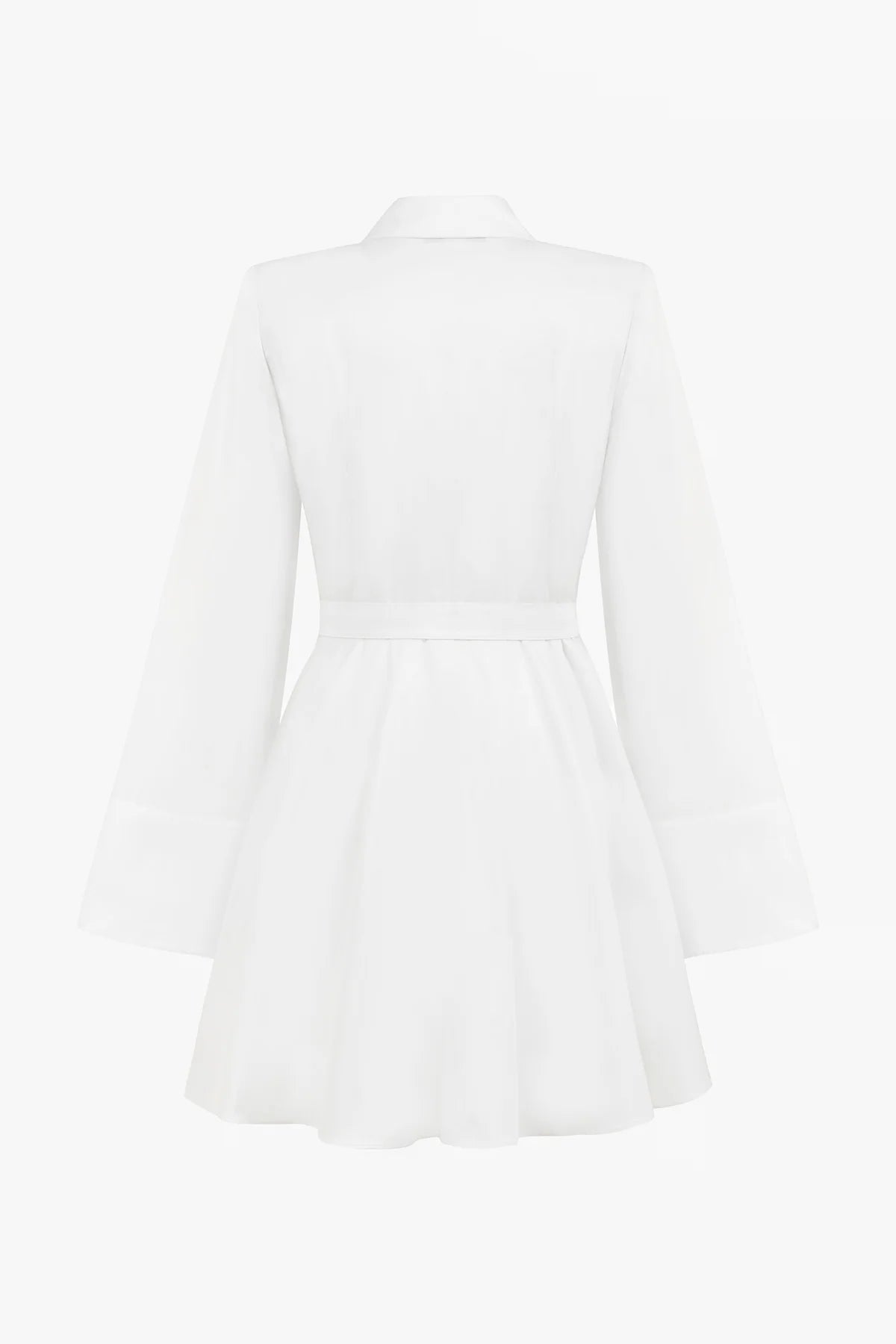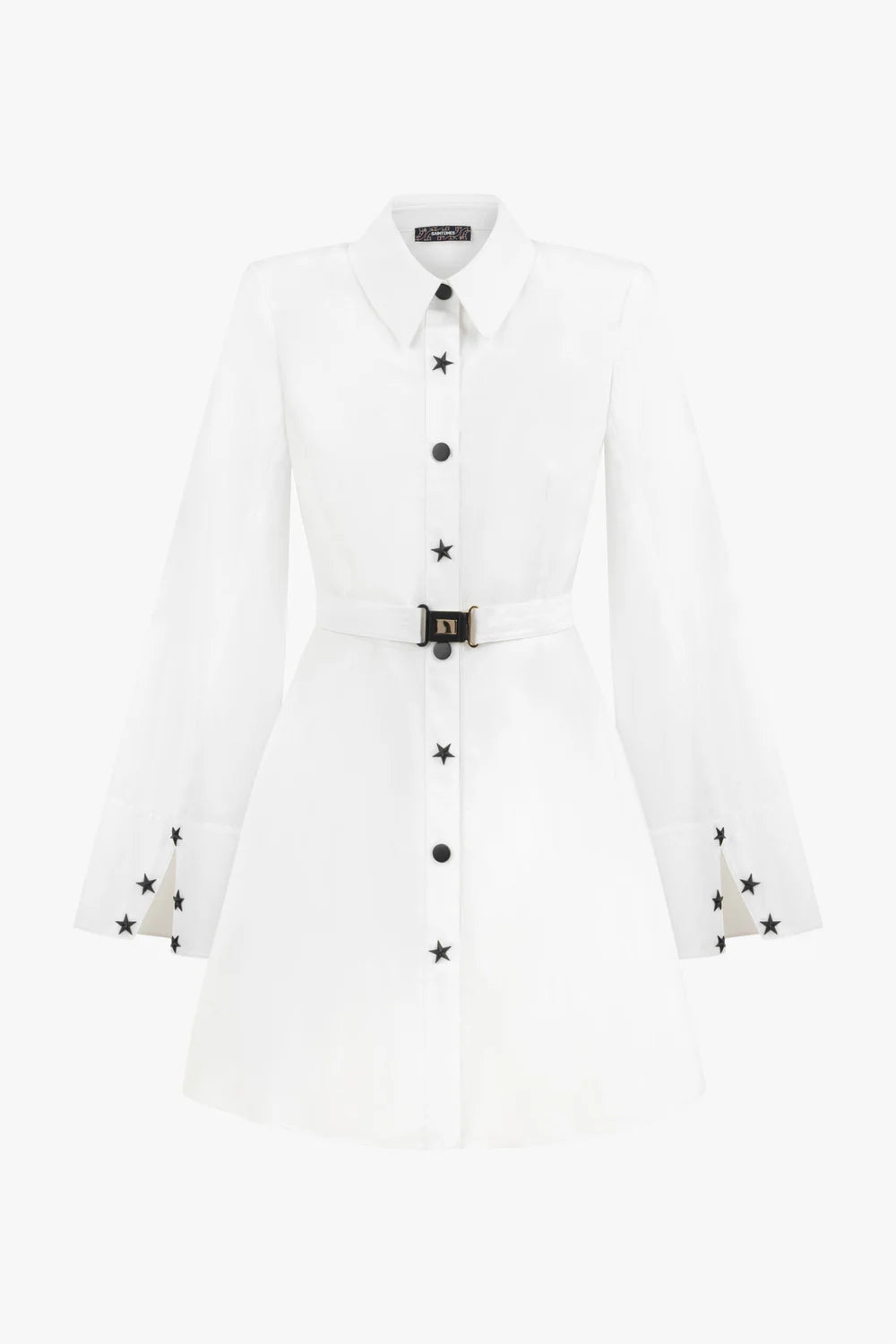 Beyaz renkte, uzun kollu mini boy gömlek elbise modelidir. Klasik gömlek yaka tasarımına ve düz bir kesime sahiptir. Ön ortadan boydan boya siyah renkli, yuvarlak düğmelerle kapanır; bu düğmelerin arasına minik siyah yıldız şekilli metal aksesuarlar yerleştirilmiştir. Bele oturan bir görünüm için, siyah tokalı kendi kumaşından ince bir kemer bulunur. Uzun kolların manşet kısımları, kesik detaylar ve bu detayların çevresine işlenmiş minik siyah yıldız süslemelerle hareketlendirilmiştir. Etek kısmı hafifçe A kesim şeklinde açılmaktadır.