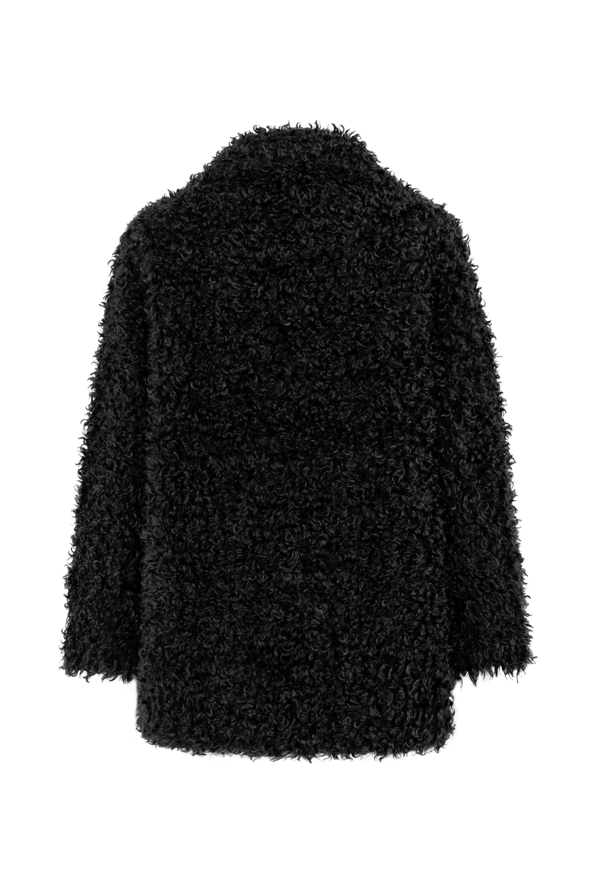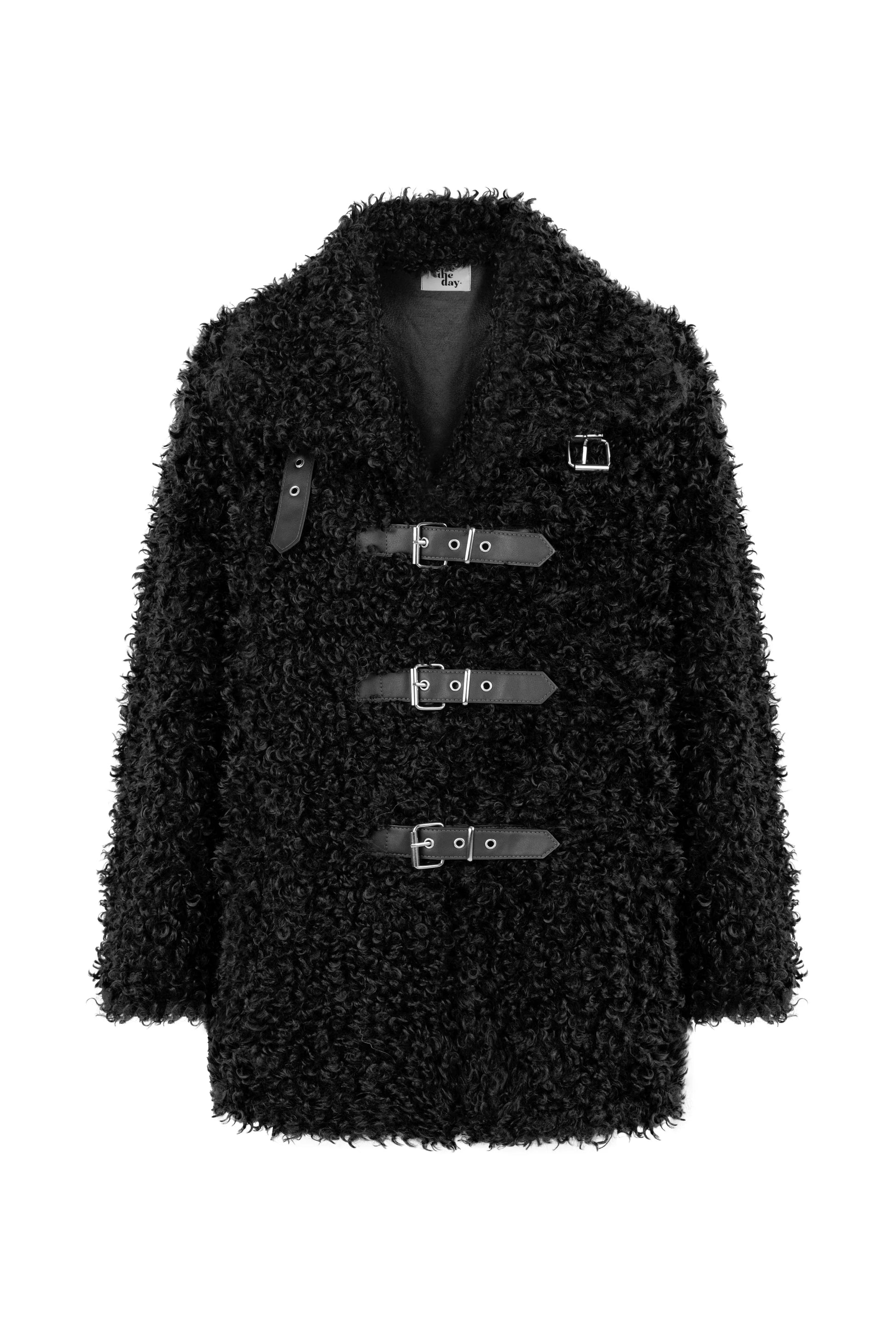 Detaylar: Kıvırcık kırçıl tüylü doku, uzun boy (85 cm), geniş ceket yaka, önde üç adet tokalı kemer kapama detayı, yakada kemer detayı.