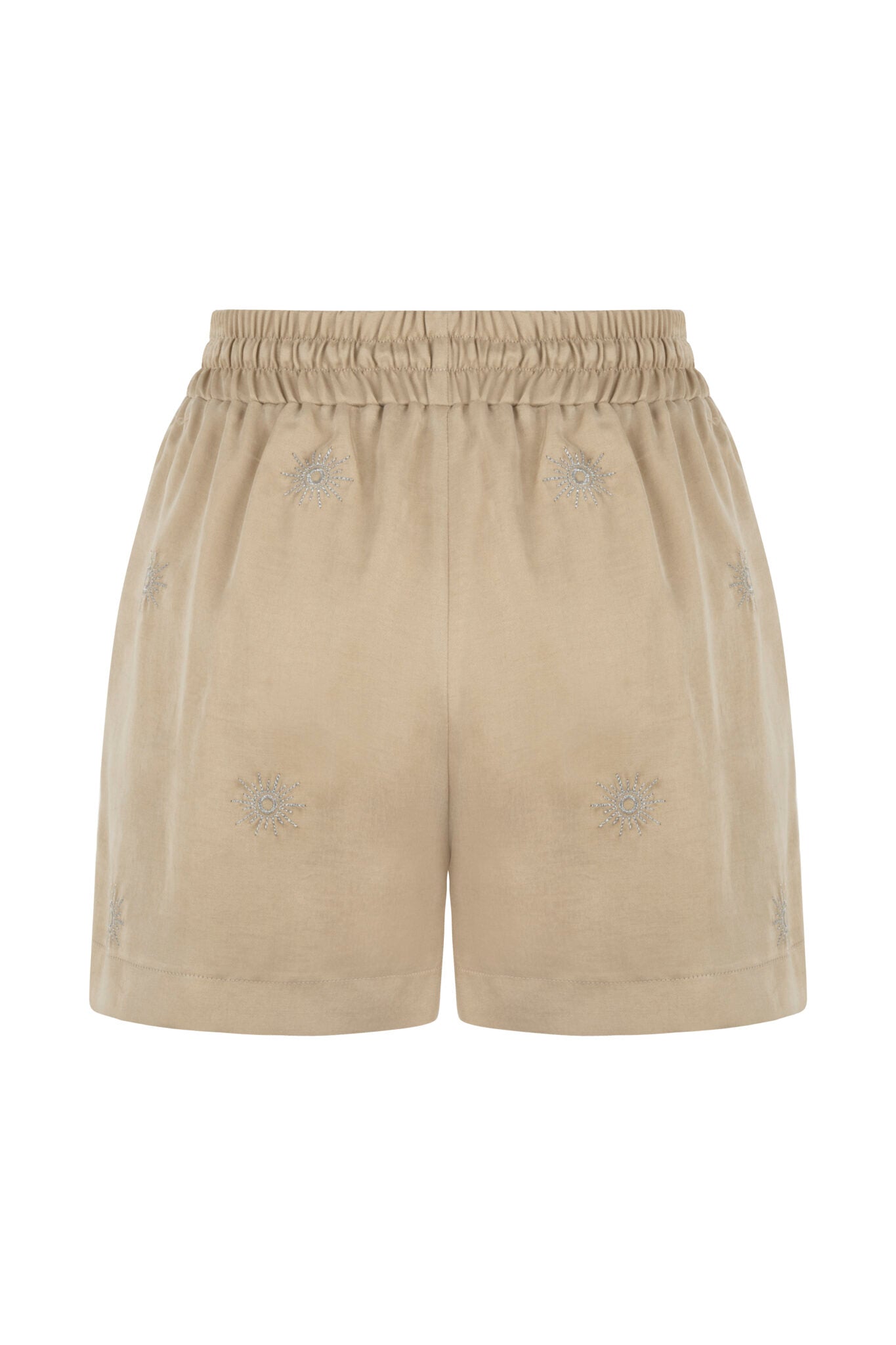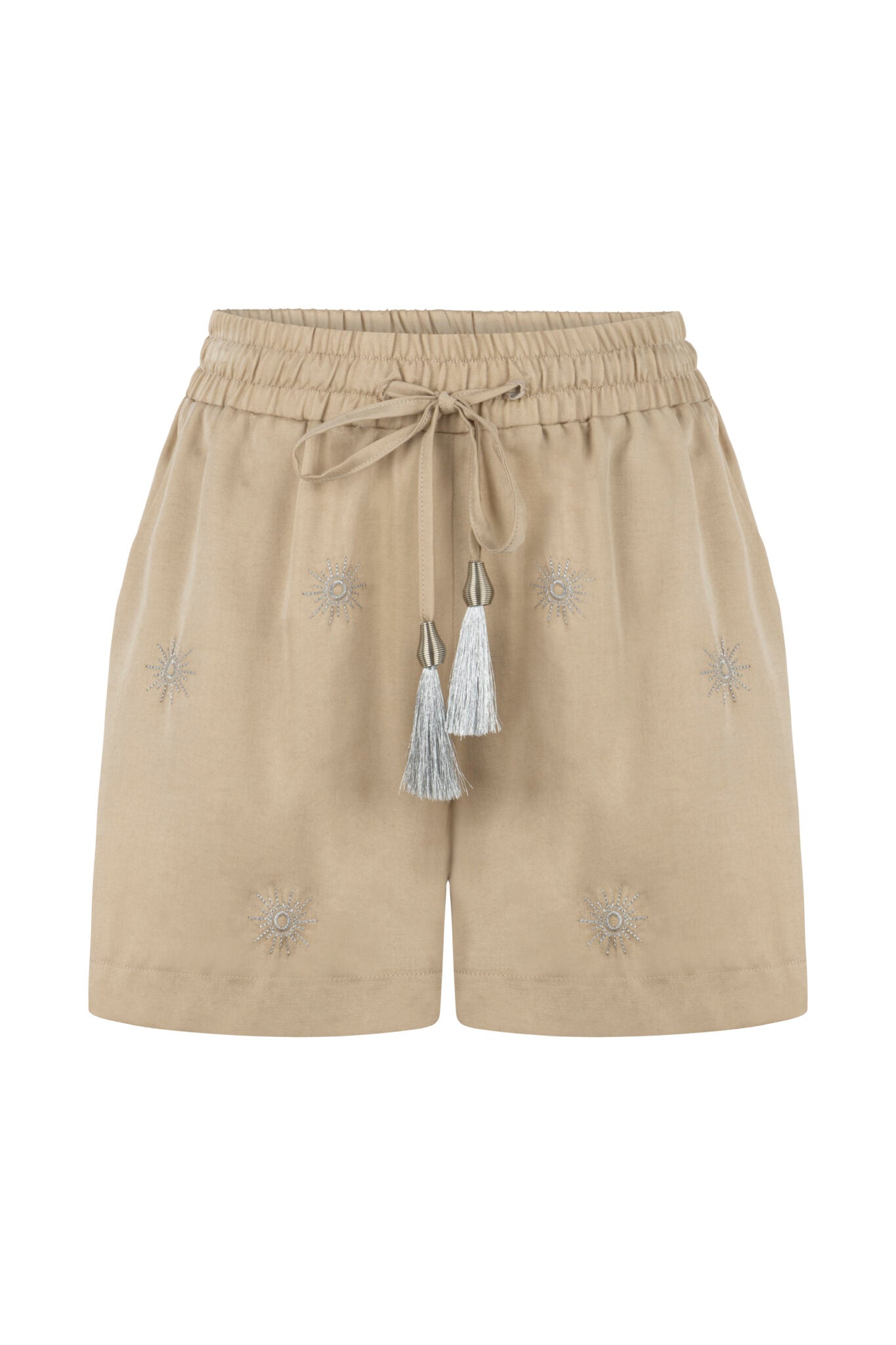 Yüksek bel, Lastikli ve bağcıklı bel detayı, Bağcık ucu püskül ayrıntılı, Nakış işlemeli şort