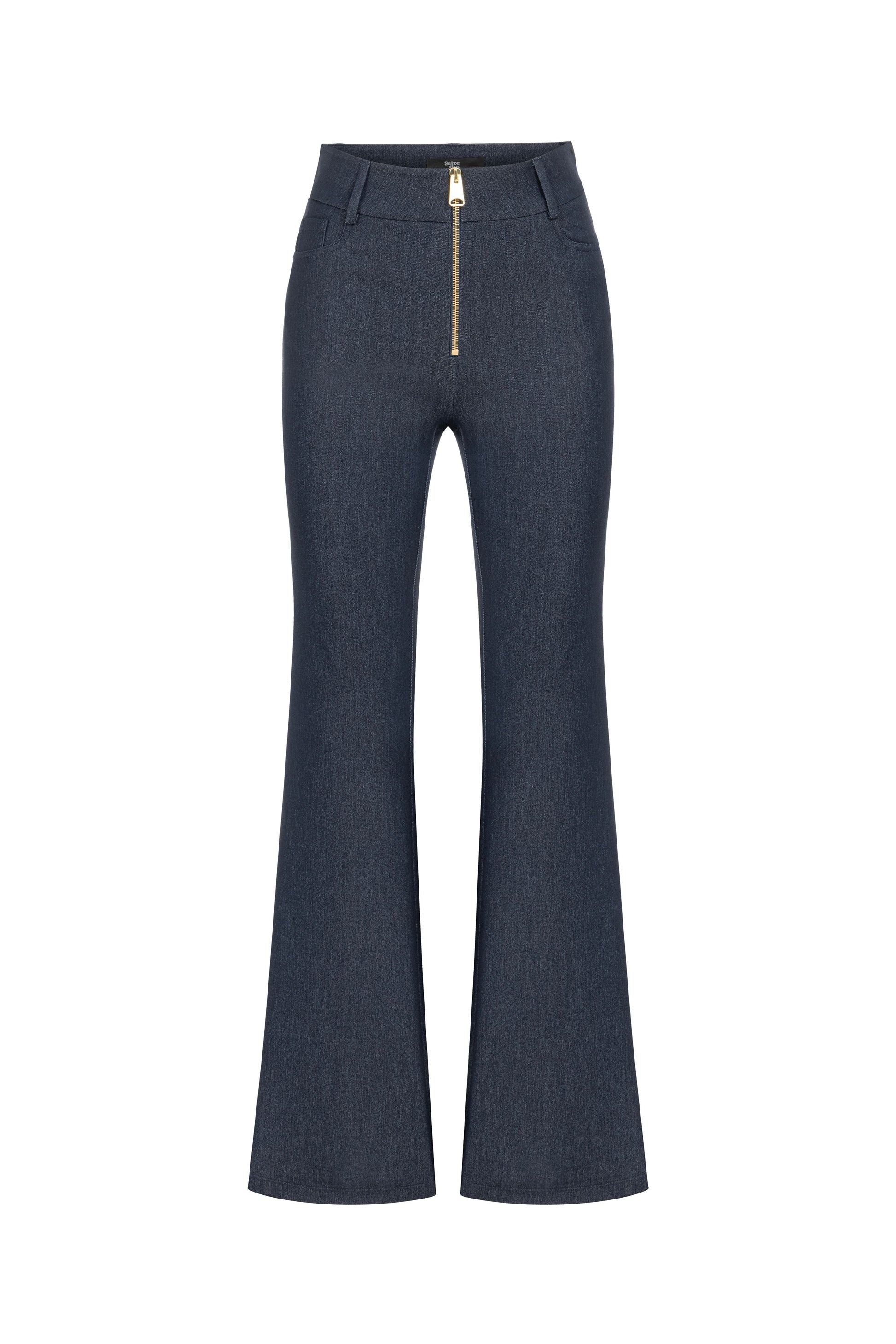 Lacivert denim görünümlü, yüksek belli ve flare kesimli pantolon modelidir. Kesimi vücudu saran ve dar kalıplıdır, diz altından itibaren paça genişler. Ön kısmında bel bandının altından başlayarak uzanan, dekoratif, uzun ve parlak altın rengi fermuar detayı bulunur. Arka kısmında yama veya kapaklı cep detayı yoktur. Bel bandında kemer köprüleri mevcuttur.