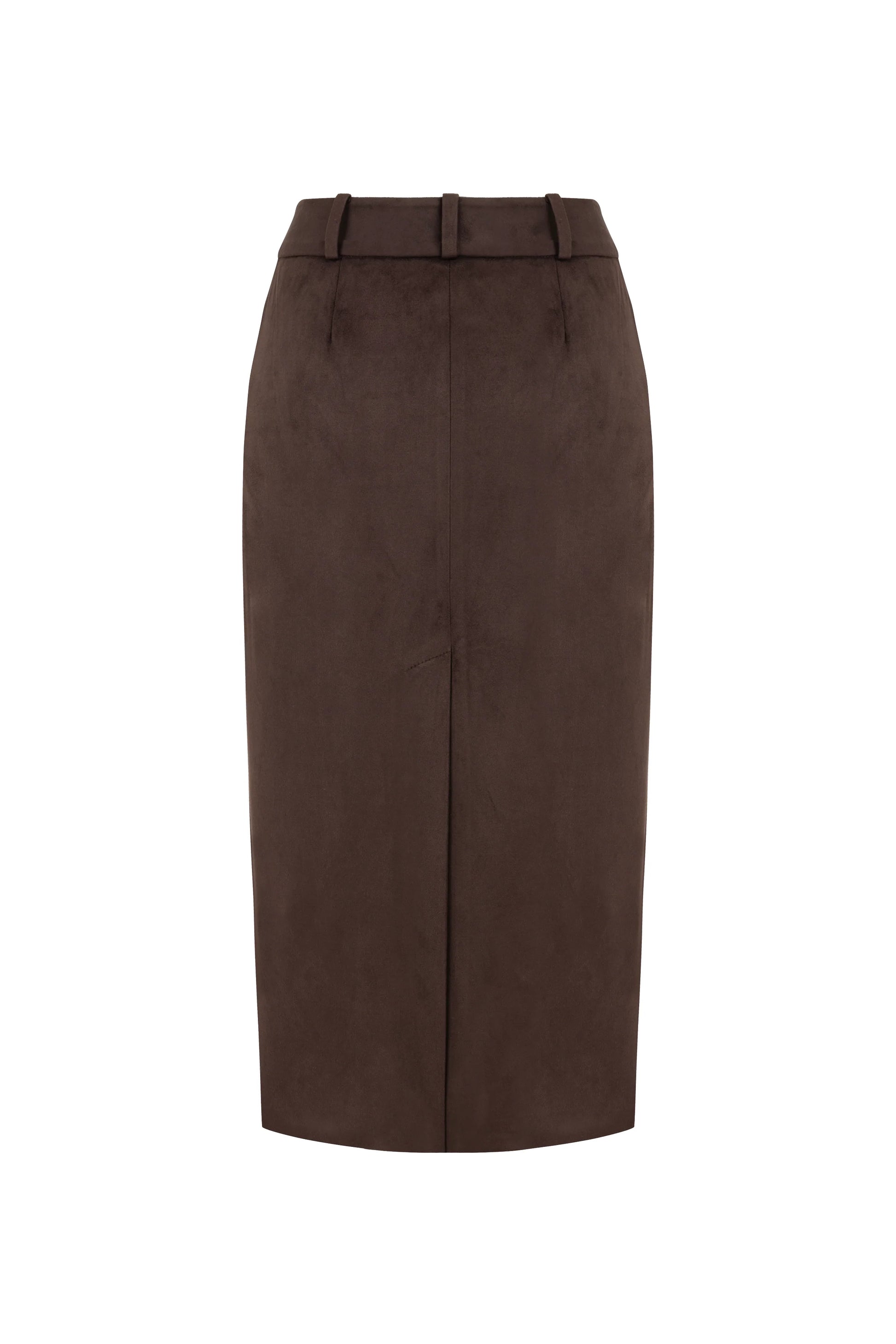 Koyu Kahverengi tonda, yumuşak dokulu süet görünümlü kumaştan yapılmış etek modelidir. Kesimi yüksek bel, vücudu saran ve diz altında biten kalem etek (pencil skirt) kalıbına sahiptir. Beli düz bir bant formunda olup kemer köprüleri bulunur ve ön kısmı gizli kapama (fermuar/düğme) detaylıdır. Arka kısmında rahat hareket etmeyi sağlayan kısa bir yırtmaç detayı bulunur.