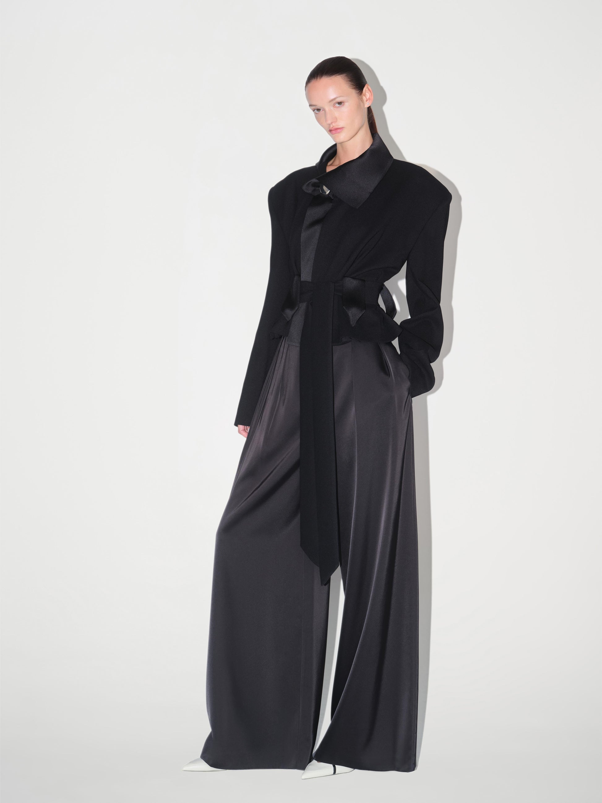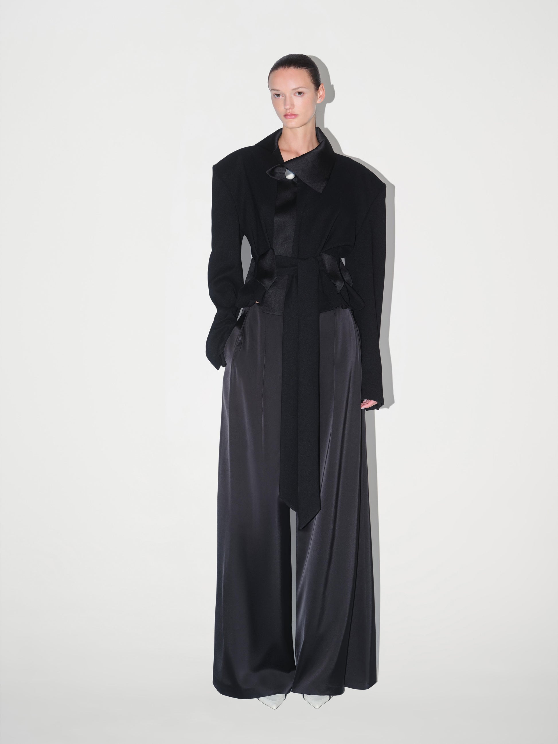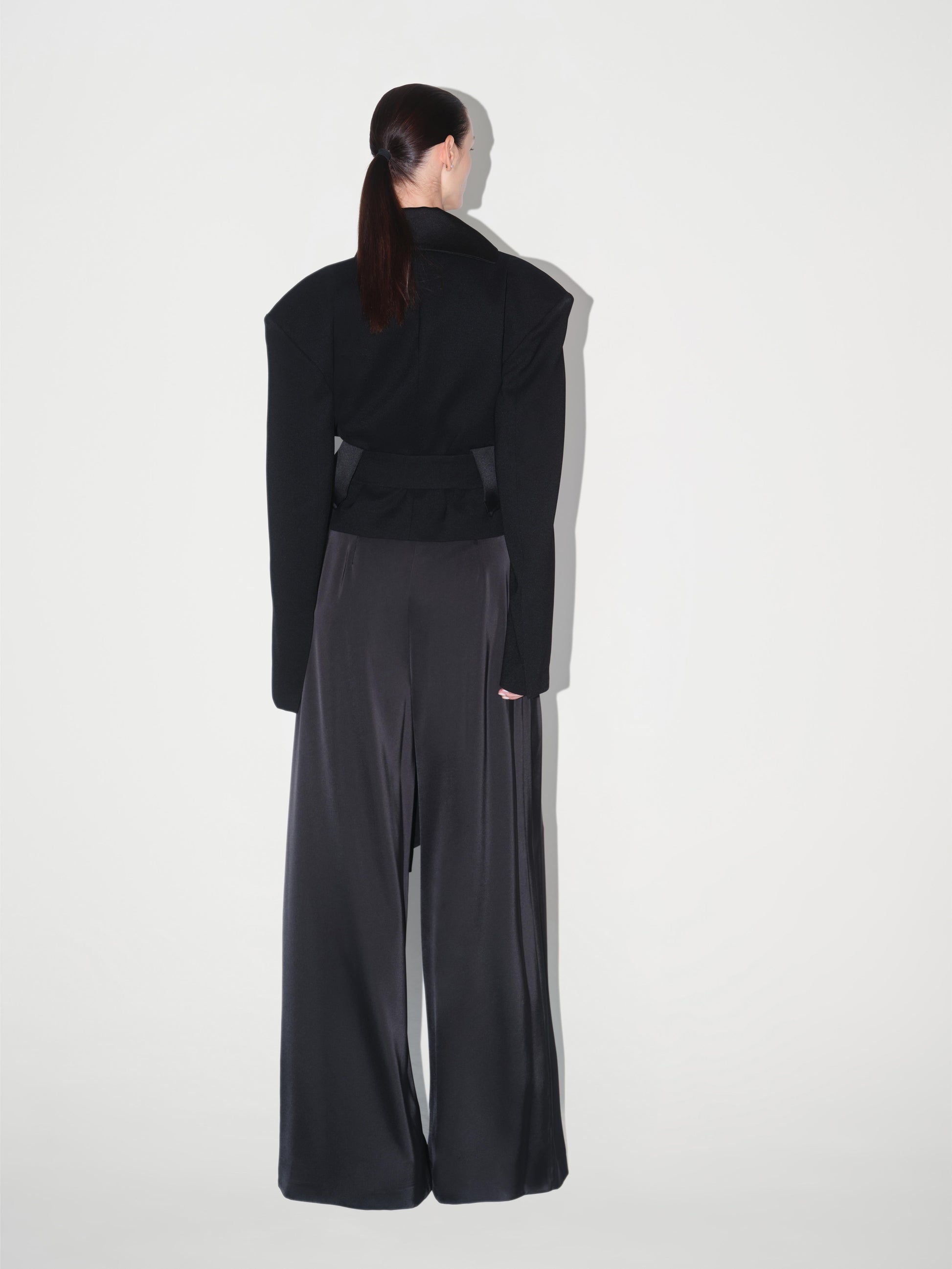 Detaylar: Kısa kesim (crop), abartılı büyük vatkalı omuzlar, şal yaka, uzun kuşak kemer, saten yaka detayı, peplum bel